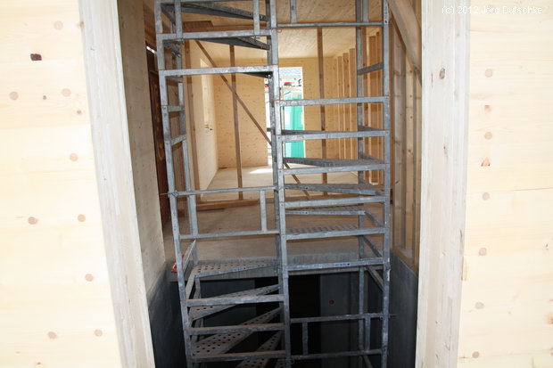 Damit man nicht ständig über das Gerüst rauf- und runter kraxeln muss, wurde unserer Baustelle noch eine Bautreppe spendiert. Über die gelangt man nun auf gewohnt einfache Art und Weise vom Erdgeschoss ins Dachgeschoss. Diese Bautreppe hat nichts mit unserer zukünftigen Treppe gemein. Es wäre aber blödsinnig, die echte Treppe jetzt schon einzubauen und zu ruinieren, wenn rüstige Handwerker mit schwerem Geschütz und spielene Kinder ständig Höhenmeter darauf antrainieren.