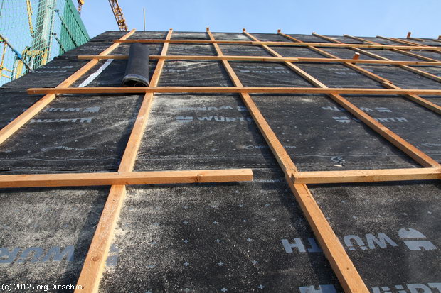 Der darauffolgende Donnerstag brachte noch mehr Holz aufs Dach: die Dachlatten für die Dachziegel wurden aufgenagelt.