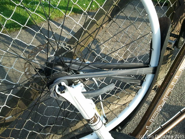 Das Vorderrad sieht echt schlimm aus. Der Mantel des Rades schlingert zwischen der Radgabel. Das Rad selbst steht auf der blanken Felge. Der Schlauch – die Lunge des Rades – hat sich beidseitig um die Nabe gewickelt. Der Teil mit dem Ventil ist straff um die Felge gespannt.