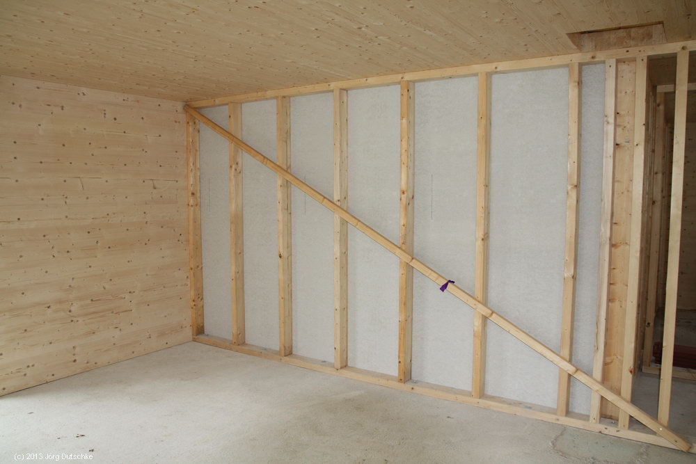 Inzwischen vertreiben wir uns die Zeit im Inneren unserer Hütte, welches ja wie berichtet und gezeigt einen recht skeletierten Eindruck nicht verbergen konnte. Daher sind wir gerade damit beschäftigt, Fermacell-Platten an die Holzständerwände zu schrauben. Eine viehische Arbeit, da die Fermacell-Platten a) sehr unhandlich und b) sehr schwer sind. Doch mit dem notwendigen Fachwissen ausgestattet, welches unsere Zimmerleute bereitwillig teilten, schaffen wir das recht gut zu zweit Abmessen, zuschneiden, ins Haus tragen, an die Wand schrauben – all das sind Arbeiten, die wir inzwischen fast schon routiniert hinbekommen. Ab und an gibt es Ecken bei denen sich dann doch die Realität vor uns aufbaut und uns daran erinnert, dass wir eben handwerklich gesehen unreif sind. Wobei ich sagen muss, dass ich inzwischen mit der Handkreissäge umgehe als ob ich nie was anderes gemacht hätte. Ich bin da aM anfang mit einer Art Unbekümmertheit herangegangen. Diese locker ignorierte Unfertigkeit und Unwissenheit erstaunt mich noch immer. Dabei hat das Ding nicht mal ne Tastatur! Von einem Bildschirm ganz zu schweigen. Die Auflösung ist ziemlich grob, aber ausreichend. Der Sound erscheint ungewohnt grausam. Der Lüfterabzug ist verstaubt ohne Ende. Arbeitet man mit so einer Handkreissäge an Fermacellplatte sieht man hinterher aus wie eine Sau. Alles – wirklich alles – schreit nach „DUSCHE“! Dabei berarbeite ich die Platten überweigend draußen, wo ein munteres Lüftchen dafür sorgt, dass die Schwaden geschwind davon segeln. Wie das jetzt noch im Obergeschoß wird, wo ich DRINNEN zusägen muss? Ständig im Durchzug arbeiten ist vermutlich auch keine gute Lösung. Mal sehen wie wir das hinbekommmen, den Feinstaub möglichst zeinah zu binden und aus dem Haus zu werfen.