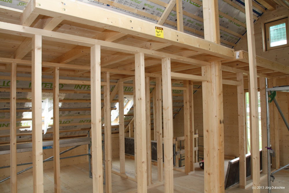 Außerdem bereits fast fertig ist die Galerie über dem Obergeschoß. Ziemlich hoch, finde ich. Ich bin schon ohne Leiter und nur mit Hilfe einer Gerüstplattform (auch ohne Leiter) da hoch geklettert. Mein Knie hat dagegen vehement protestiert und schmollte noch drei Tage später über die absolut nicht altersgerechte Behandlung. Doch Häuslebauer kennen keinen Schmerz. Das haben sie mit Indianern gemein.