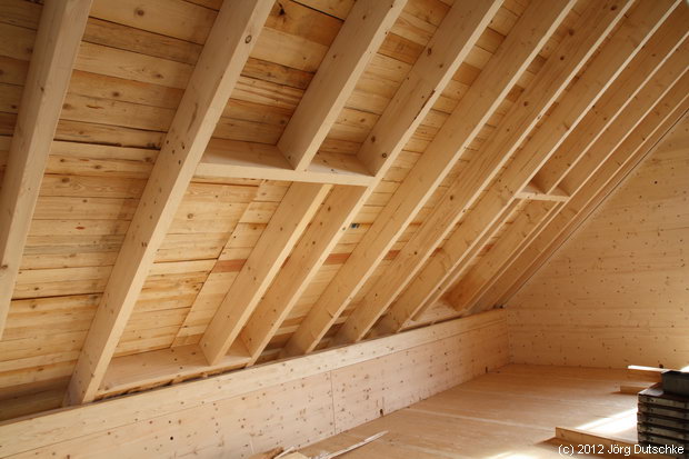 Am letzten Mittwoch wurde die grüne Dachfolie durch richtige Holzbretter ersetzt. Das Dach wurde sozusagen fast dicht. Seit dem verstärkt sich im Inneren des Hauses immer mehr der Holzgeruch. Er ist allgegenwärtig und absolut hinreißend. Ich vermute, dass ich erstmalig in meinem Leben einen Handwerkertraum haben werde, wenn ich mal in unserem Holz100-Haus nächtige.