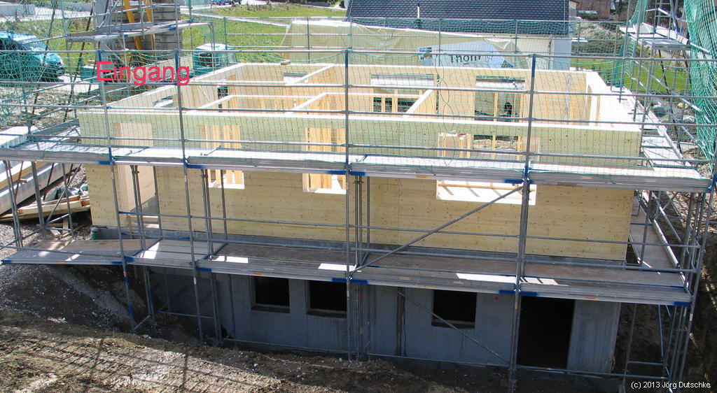 Tja … jetzt ist wegen Wetter erstmal Pause. Aber gutes Wetter ist in Sichtweite und wenn alles gut geht, dann steht kommende Woche unser Haus samt Dachstuhl. Nachdem die Jungs für das Erdgeschoss heute keine 3h gebraucht haben, ist das eine realistische Prognose.