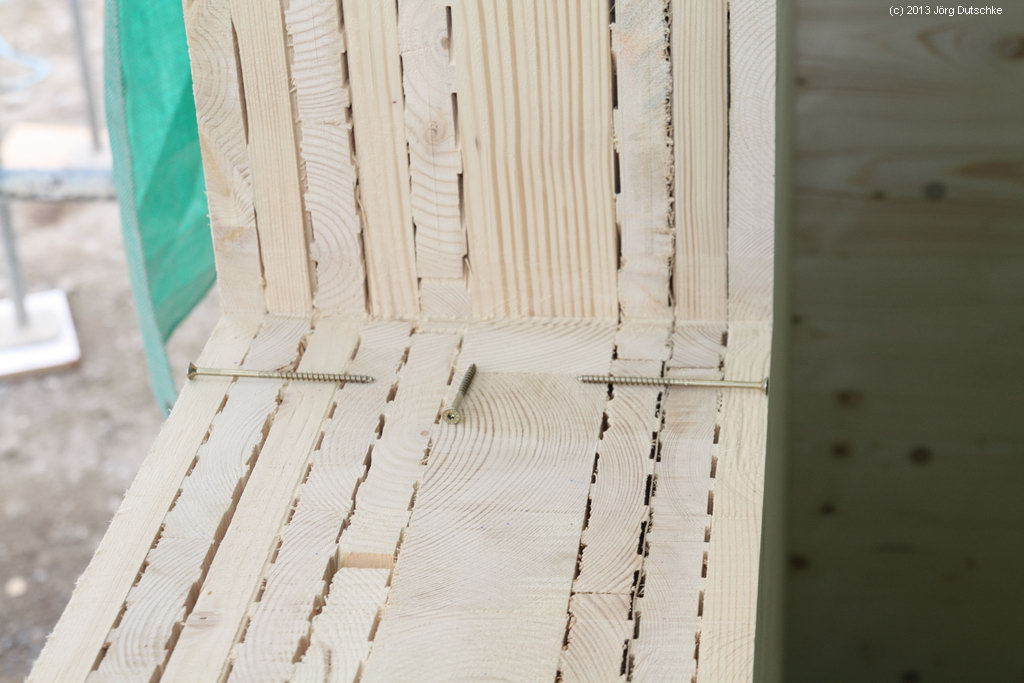 Nachtrag wegen der Schrauben auf dem Wandbild: Nein – die Schrauben werden nicht verwendet, um die einzelnen Bretterlagen der Wand zusammenzuhalten. Das wird durch Dübel erreicht!