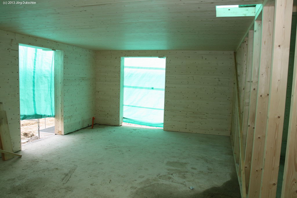 Bereits beim Betreten ändert sich die Luft: es duftet nach Holz. Ein herrlicher Duft, wenn ich das einmal unterstreichen darf. Im Inneren des Hauses allerlei Zwischenwände. Das sind die Dinger, welche Anfang der Woche mangels besserem Wetter zusammengezimmert worden waren. Jetzt trennen die Holzgerippe bereits die Räume.